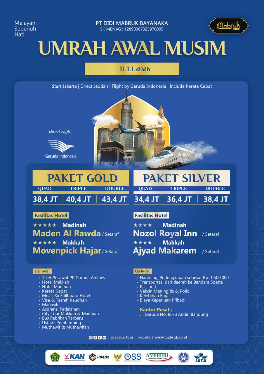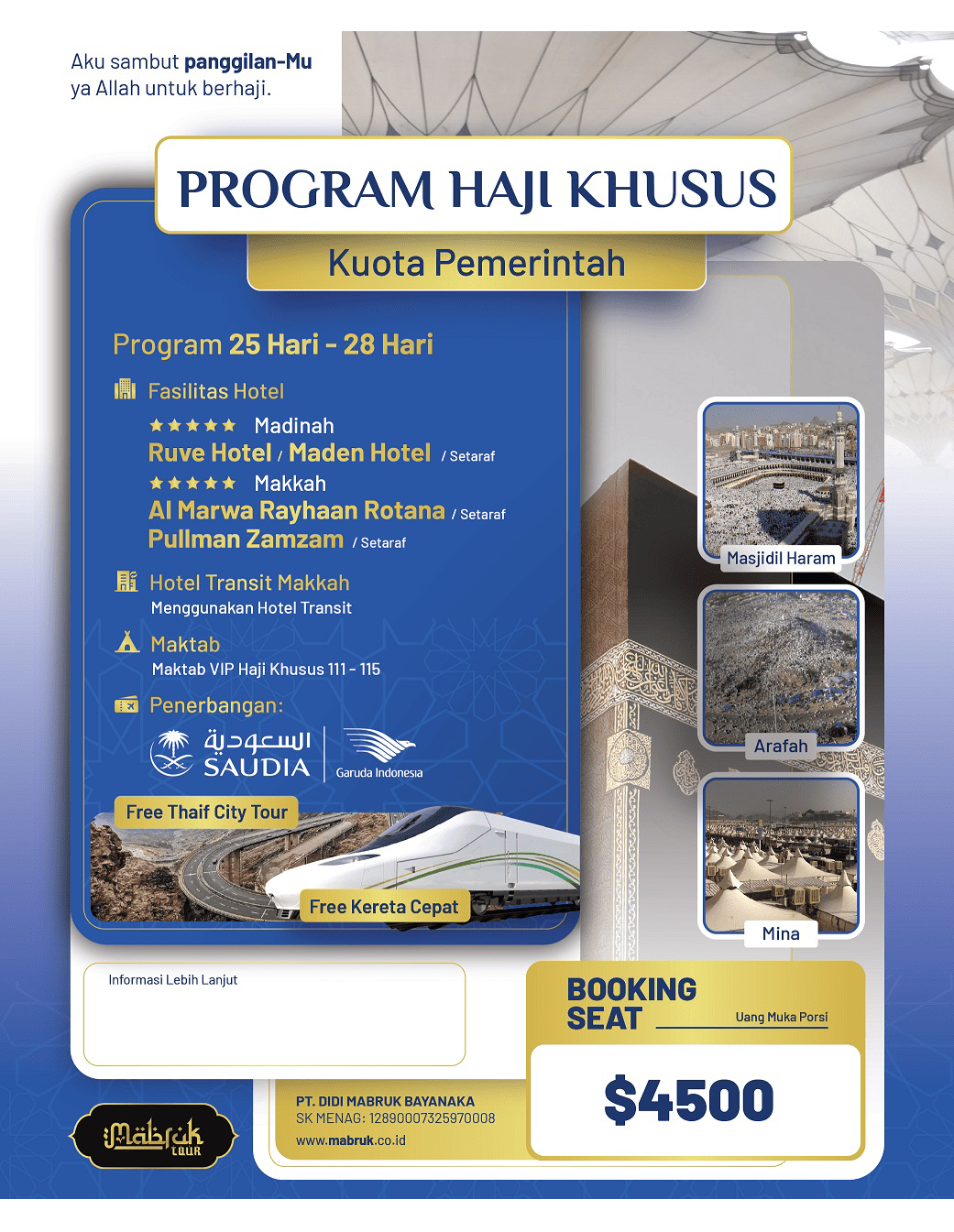Mabruk Tour adalah Penyelenggara layanan Haji dan Umroh yang berijin dan terdaftar di PIHK Kemenag. Dengan demikian kami adalah salah satu penyelenggara haji yang sah sesuai dengan peraturan dari pemerintah. jika daftar Haji Khusus sekarang ini, diperkirakan masuk kira-kira Haji 2034. Daftarkan keluarga Anda agar segera dapatkan nomor porsi dengan Uang Muka $4.500.